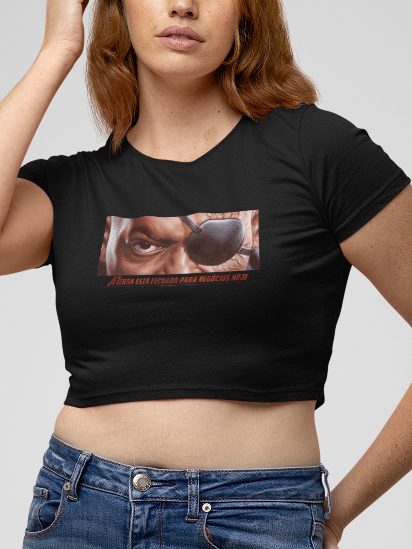 Blusa Cropped Nick Fury, Vingadores - Coleção Janelas da Alma - “A TERRA ESTÁ FECHADA PARA NEGÓCIOS HOJE”
