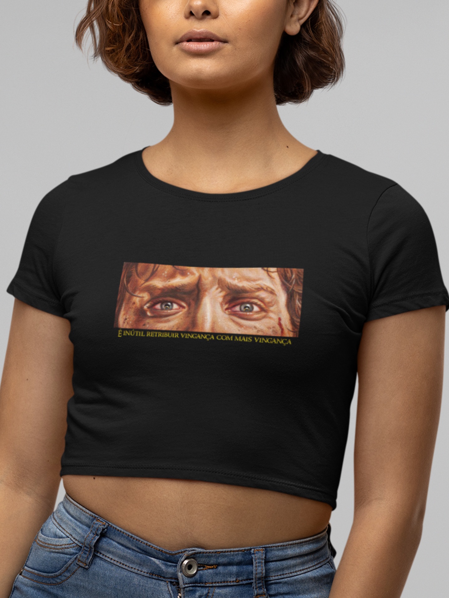 Blusa Cropped O Senhor dos Anéis - Coleção Janelas da Alma - "É INÚTIL RETRIBUIR VINGANÇA COM MAIS VINGANÇA"