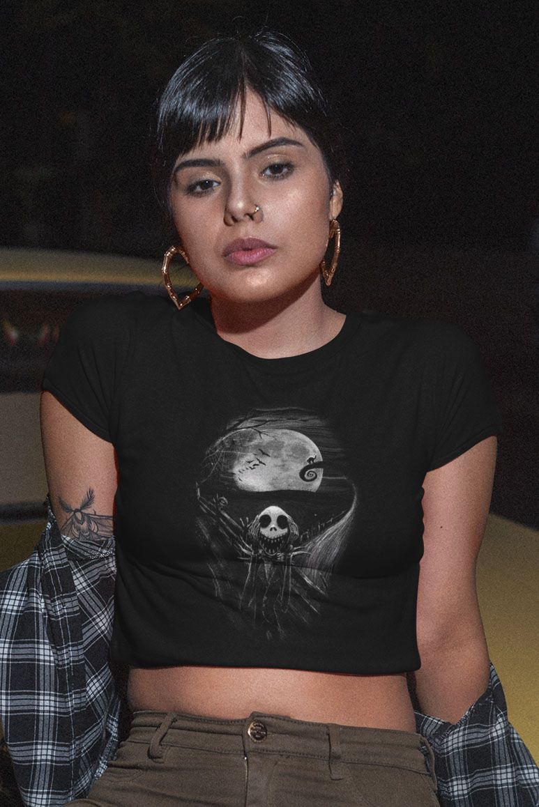 Blusa Cropped com estampa O Estranho Grito de Jack – uma mistura irreverente entre o clássico do terror gótico de Tim Burton e a arte expressionista de Munch. Perfeita para fãs de cultura pop sombria e estilo alternativo com toque artístico.